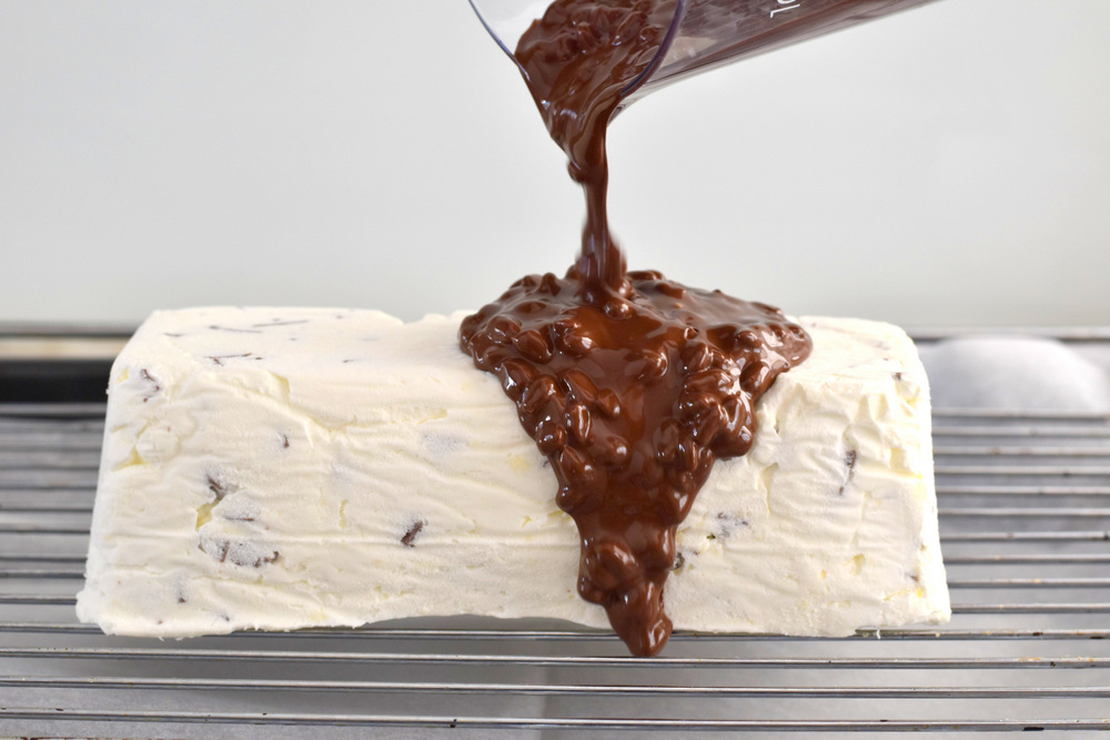 יוצקים את השוקולד המריר על הגלידה הקפואה ומצפים מכל הכיוונים.